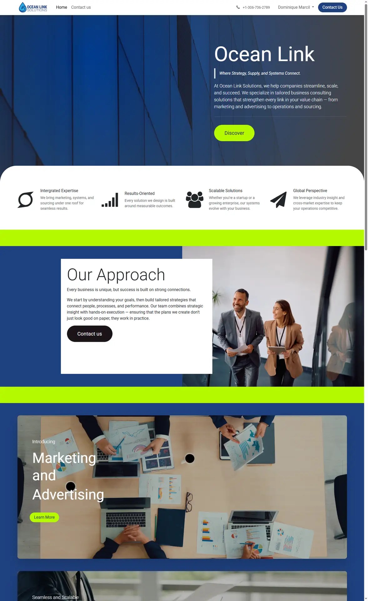 Built on Odoo, Ocean Link is a streamlined web solution designed as a high-impact landing spot for B2B partners. We delivered a bold, modern aesthetic that remains strictly cohesive with the brand identity we developed. By leveraging the client’s existing platform, we created a seamless bridge between their public-facing site and their internal CRM, ensuring data consistency and operational efficiency.